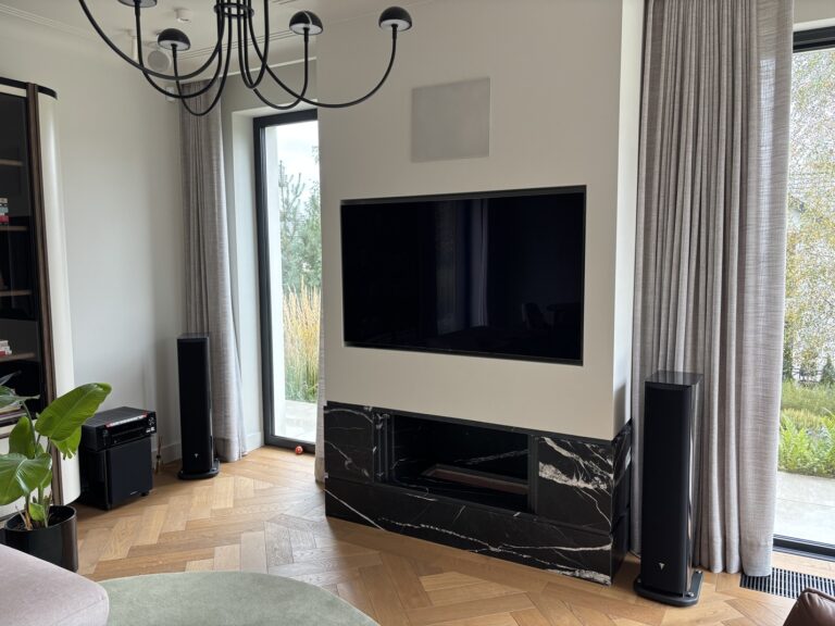 Podczas realizacji kina domowego i systemu Multiroom w Gdynia Dąbrowa wykonaliśmy kino domowe oparte o wolnostojące głośniki firmy Focal i centralny zabudowany w ścianie Sonus faber oraz amplituner Denon.